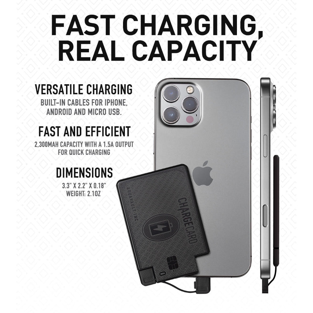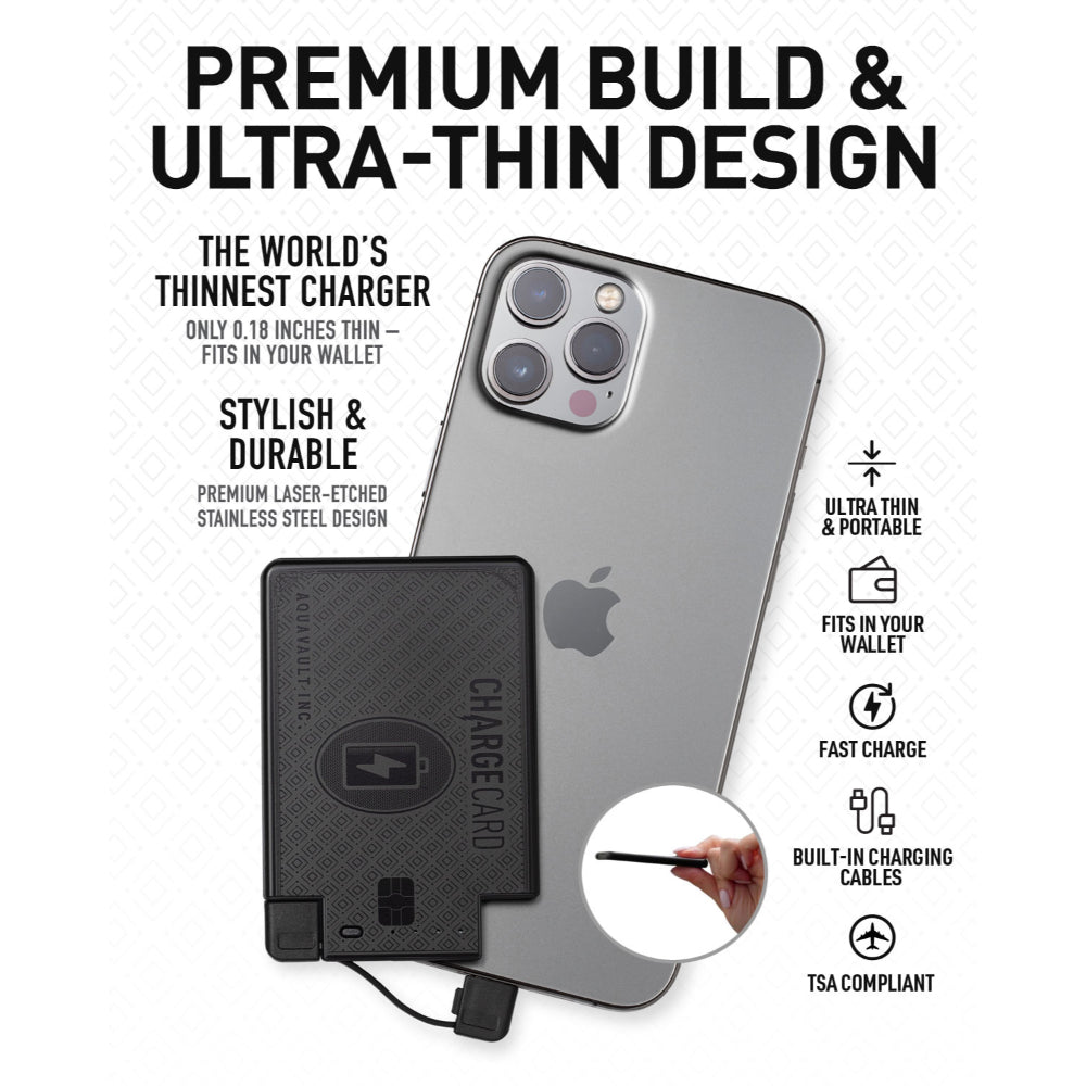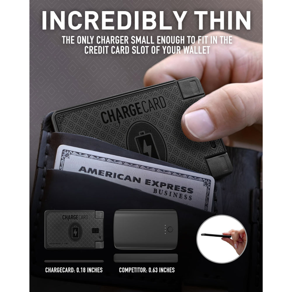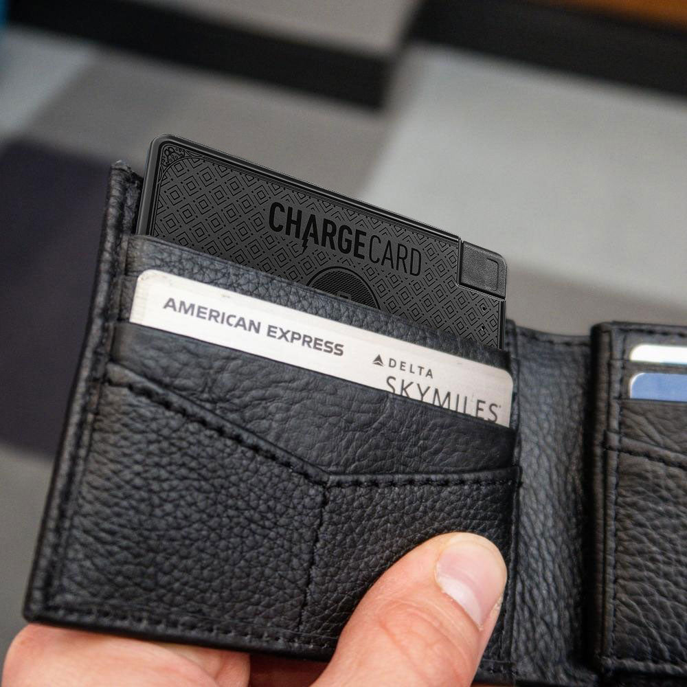 - The ChargeCard is a Credit-Card-Size Portable Charger that actually fits in your wallet (Most likely the smallest charger you have ever seen)