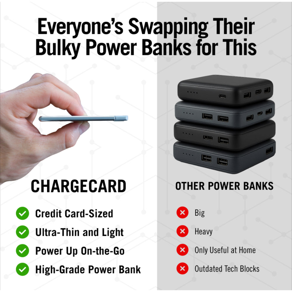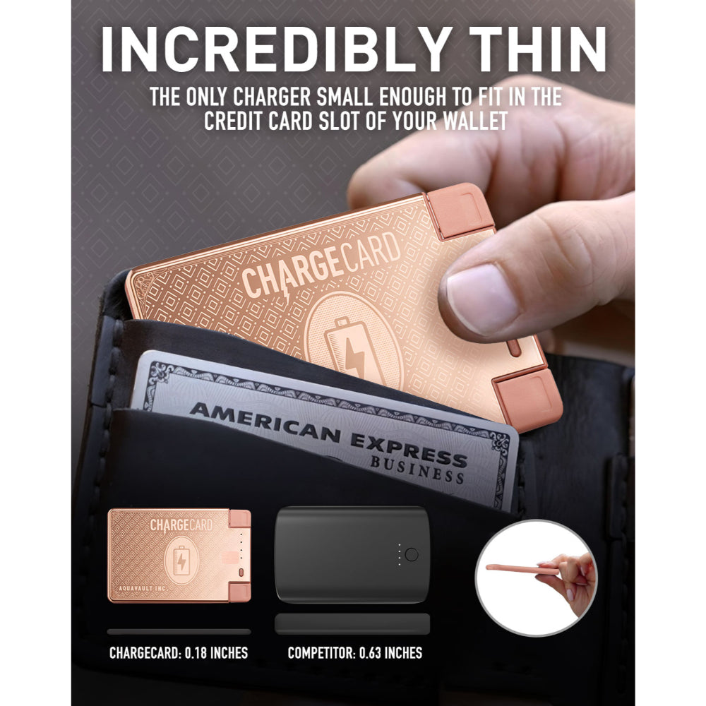 - The ChargeCard is a Credit-Card-Size Portable Charger that actually fits in your wallet (Most likely the smallest charger you have ever seen)